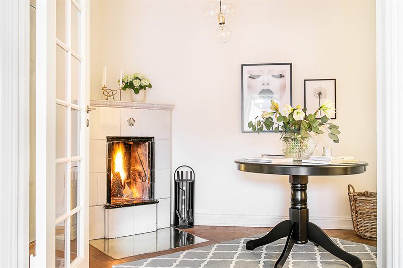 En riktig drömhall i den här lägenheten som vi stylade förra veckan. Hur fint med öppen spis, och en perfekt plats för ett pelarbord med en pampig bukett på. Kika mer här.